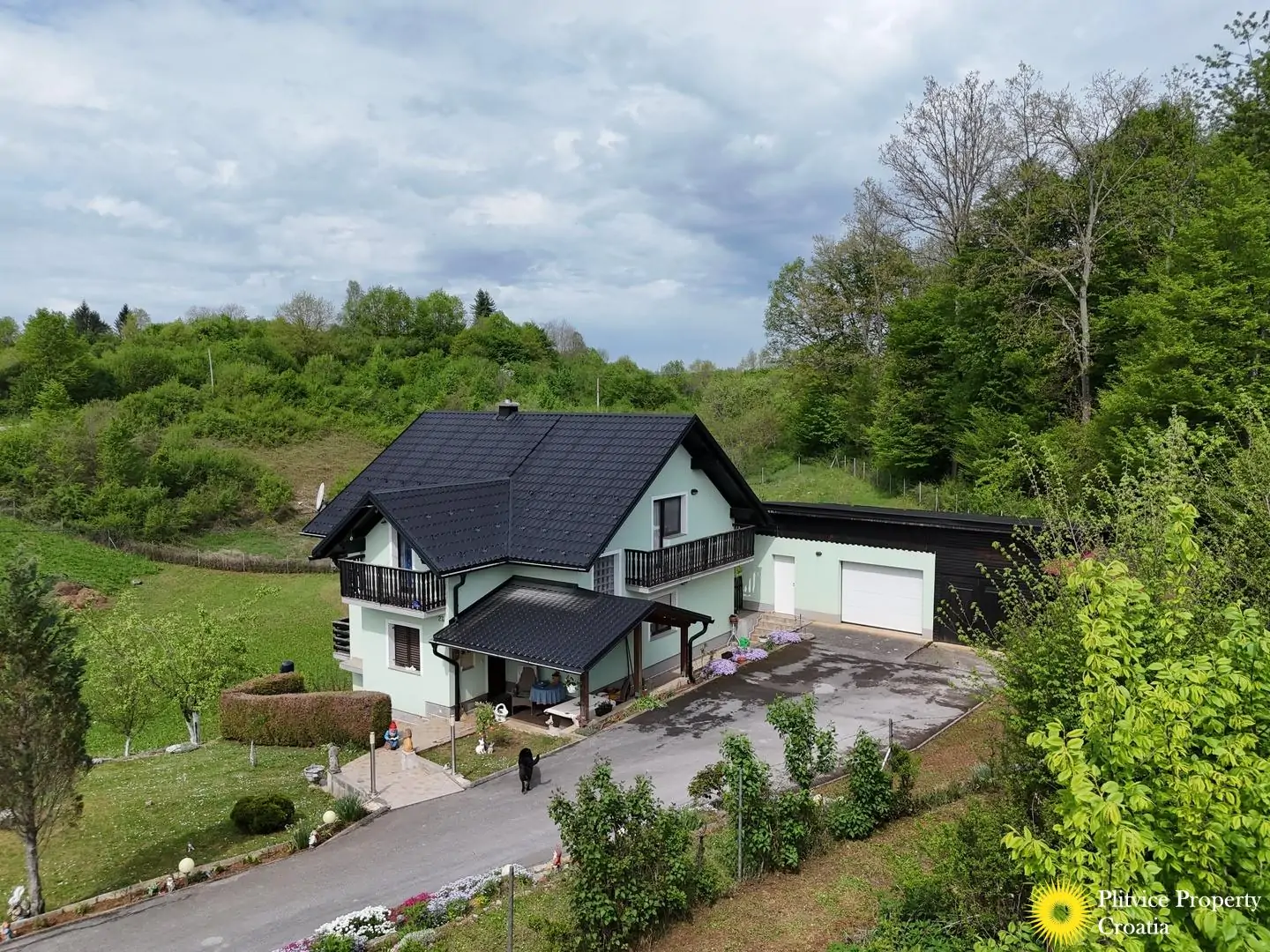 Teren wokół domu to połączenie pięknej doliny, z drzewami owocowymi, orzechowymi i winoroślami, które zapewniają spokojną, naturalną atmosferę. Wokół domu posadzono piękne kwiaty, które podkreślają malownicze otoczenie. Obok domu znajduje się warsztat lub pomieszczenie gospodarcze, a także garaż i składzik na drewno, który w razie potrzeby można łatwo przekształcić w dodatkowy garaż.