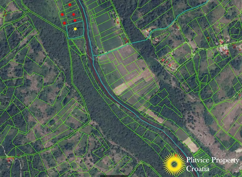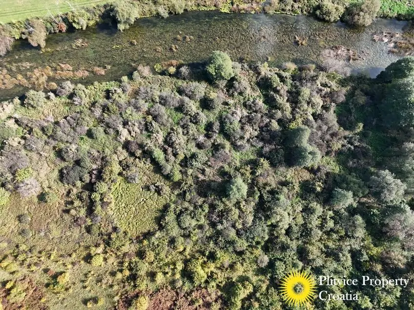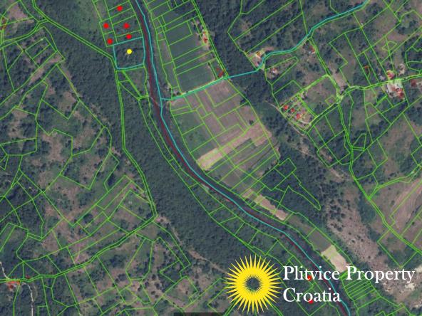 This agricultural land is located in Koransko Selo, directly along the Korana River. It spans a total of 15,997 m² and is divided into two parts: a larger section consisting of six connected parcels and a smaller section made up of two parcels.