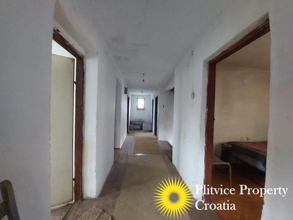 The house is spread over three levels: ground floor, first floor, and an attic. While the property requires a complete renovation, it offers a solid foundation and spacious layout to create a comfortable home. Two balconies provide beautiful views of the valley where the Glina River flows, adding to the charm of the setting.