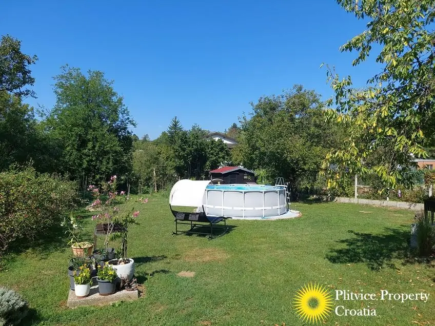 Outside, the property includes a storage room, a covered terrace with seating space, a swimming pool, a few fruit trees, a vegetable garden, and a small wooden tool shed.