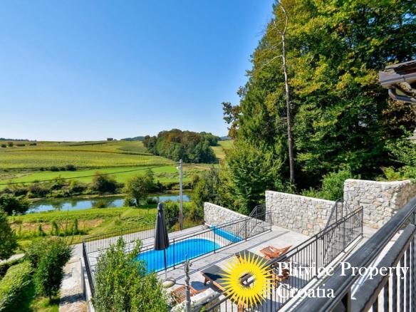 The dining area is framed by large windows offering breathtaking views of the Dobra River, while three terraces and a balcony provide perfect spots to relax and enjoy the landscape. Outside, there is a private pool and jacuzzi, ideal for unwinding in complete privacy while listening to the nearby river.